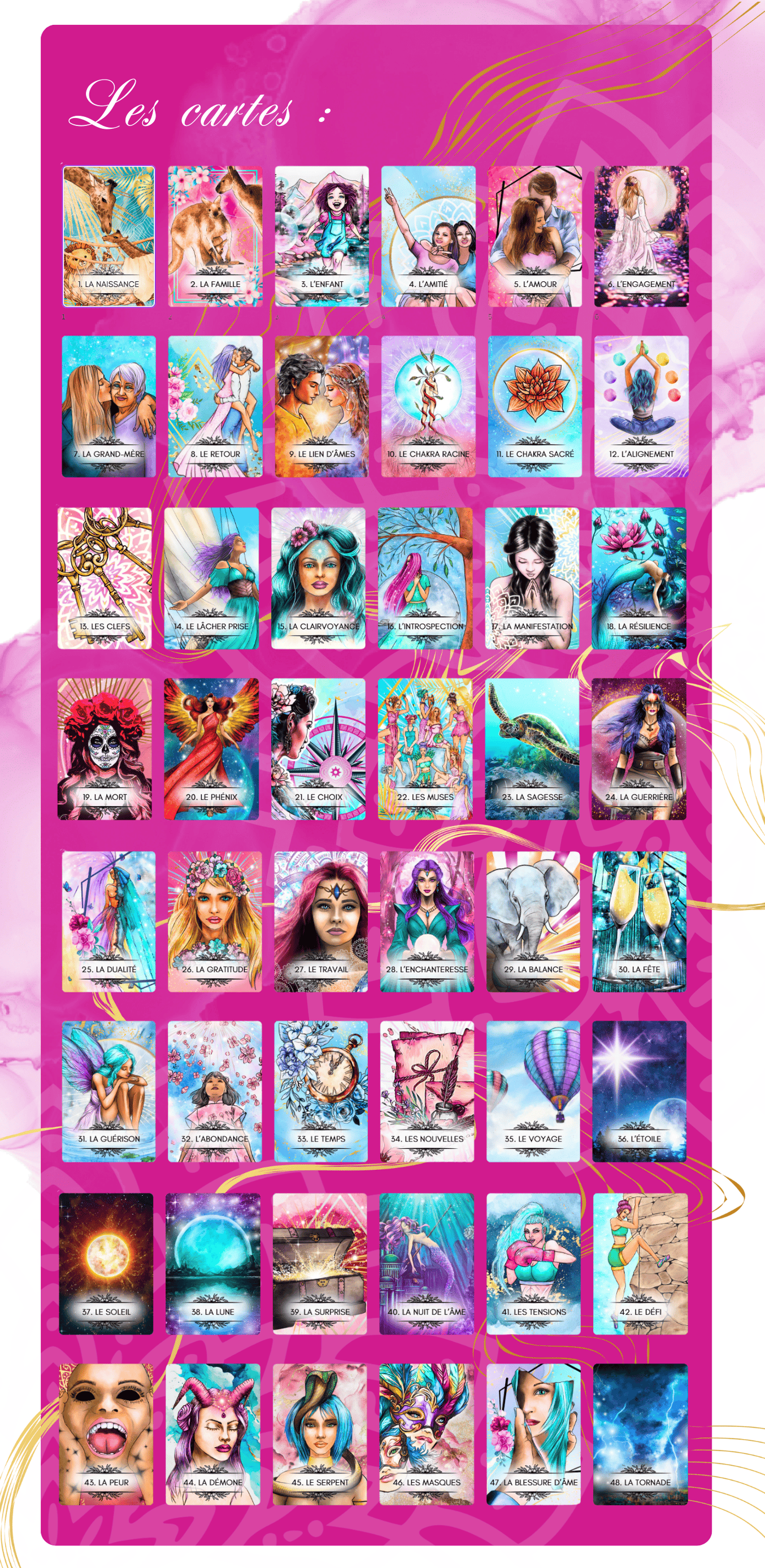 L'oracle comporte 48 cartes imprimées sur papier 350g avec un pelliculage brillant pour une finition de qualité. Le livret de 64 pages, au format A5, est imprimé sur papier glacé en couleur finition satinée. Le pochon en satin ainsi que les cartes et le livret sont produits en France et en Belgique.