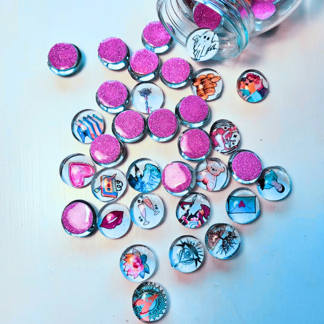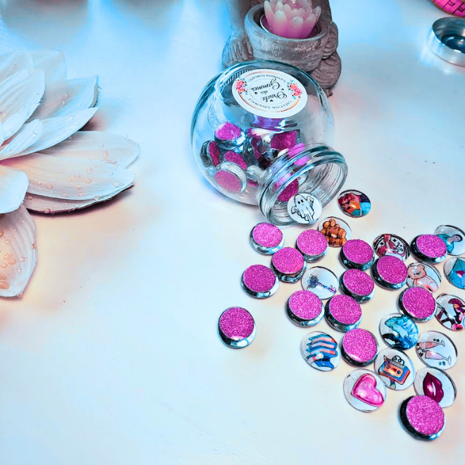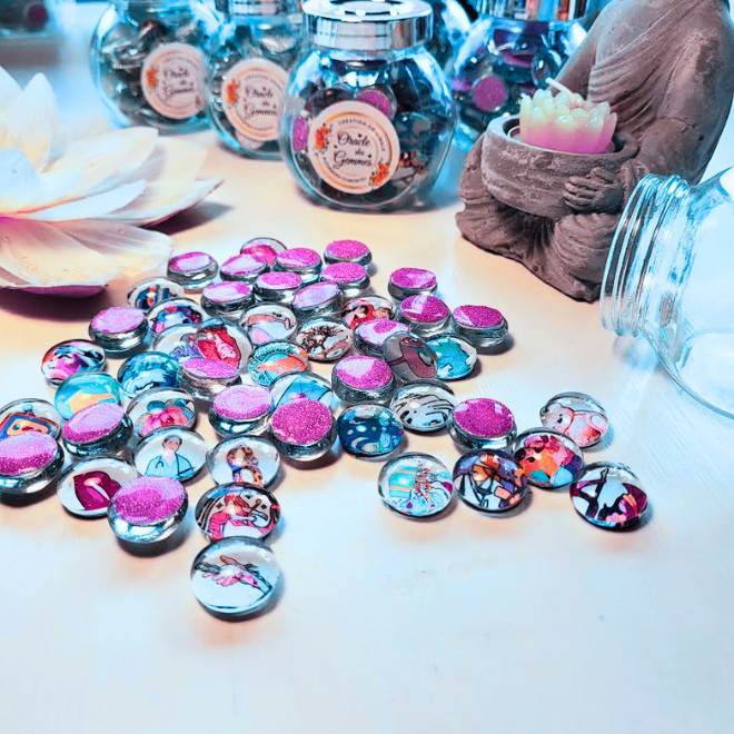 L'oracle comporte 50 petites gemmes en verre renforcé et résine, entièrement réalisées à la main. Il est fourni avec un livret explicatif au format A5 ainsi qu'un pochon de rangement en satin (la bouteille n'est pas incluse). Couleur des paillettes au dos aléatoire.